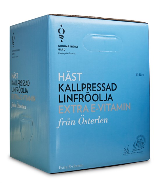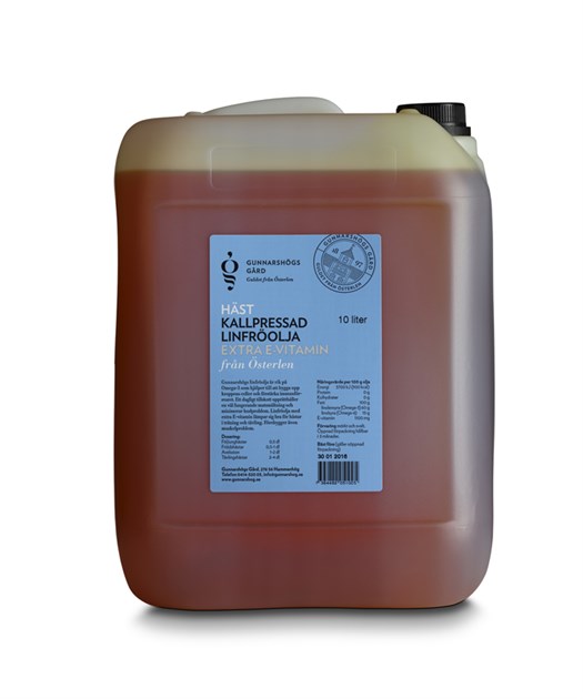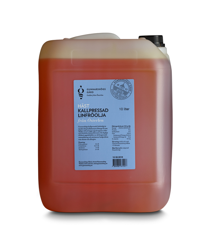Linfröolja med extra E-vitamin lämpar sig bra för hästar i träning och tävling och förebygger även muskelproblem. Gunnarshögs kallpressade linfröolja är mycket rik på alfalinosyra (omega-3) som hjälper till att bygga upp kroppens celler och förstärka immunförsvaret, våra hästar mumsar glatt i sig oljan i sina måltider var dag.